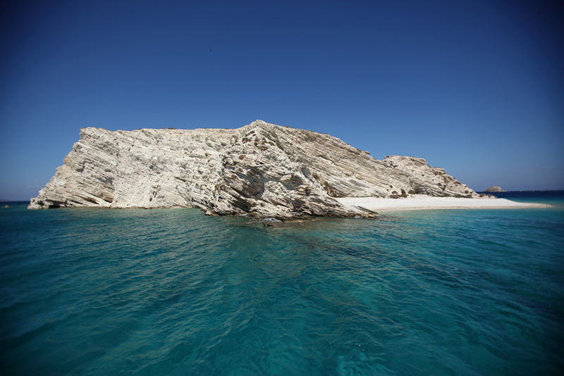- These deposits eventually solidified into the pale white deposits that give Aspronisi its moniker of the "White Isle".[4] The base of the island is composed of black lava rock, and the island is connected to the larger islands of Therasia and Santorini by the submerged outer edge of Santorini caldera.