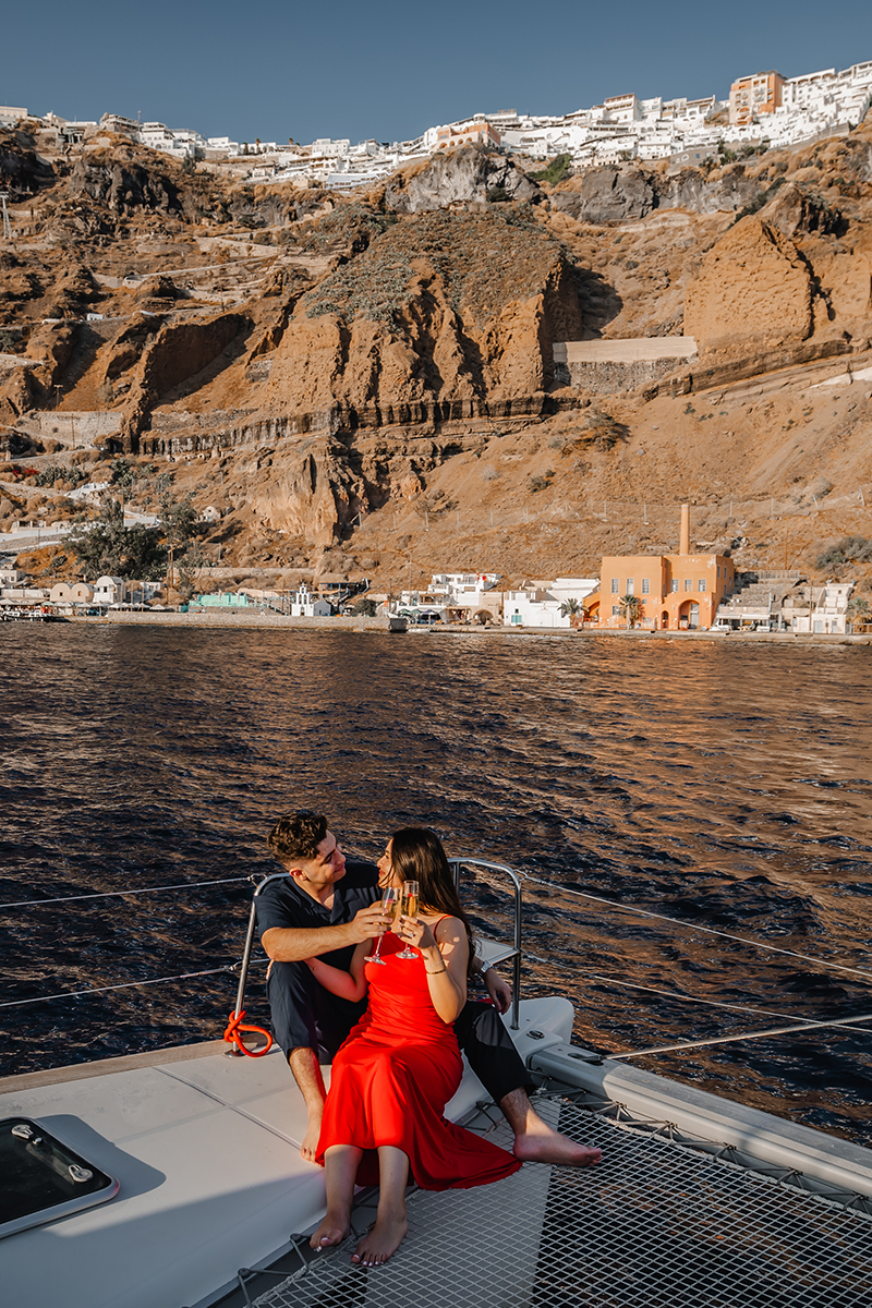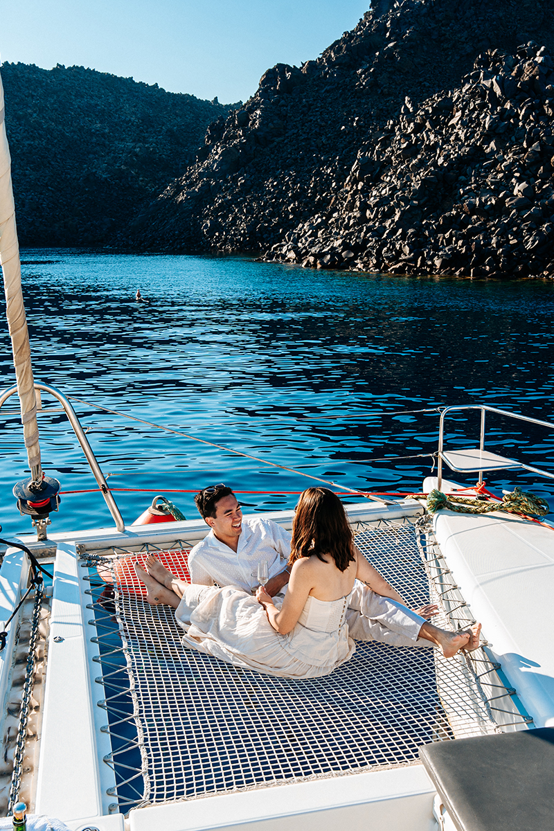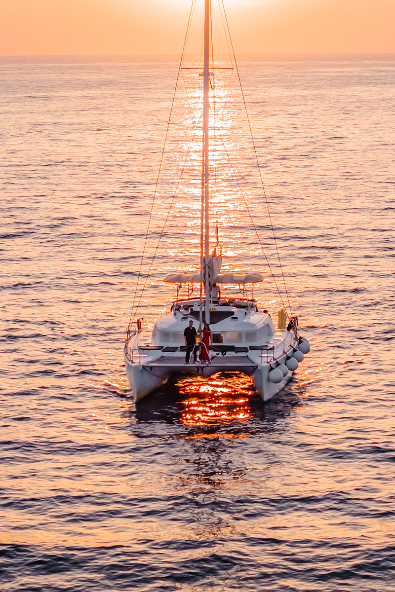 WHAT CLIENTS SAY ABOUT US Fun 4-5 hour cruise around the island with multiple stops and facts, and great food. The cruise was an absolute blast. Trip was 15:30 to 20:30. It was my wife and me plus 8 others, mostly couples. We all had a really good time with each other and the two captains. It was windy and the seas in certain parts were rough, but the catamaran did just fine. We made several quick stops at cool landmarks and points of interest, plus we got to swim at the hot spring. They gave us many drinks, including beer, white wine, coke, and water throughout the entire ride. They made some amazing food for us at our last stop, including Greek salad, grilled chicken and sausage, clams, shrimp, tzatziki, rice, and more. To top it off, we got to watch a gorgeous sunset on our way back to the port. Highly recommend